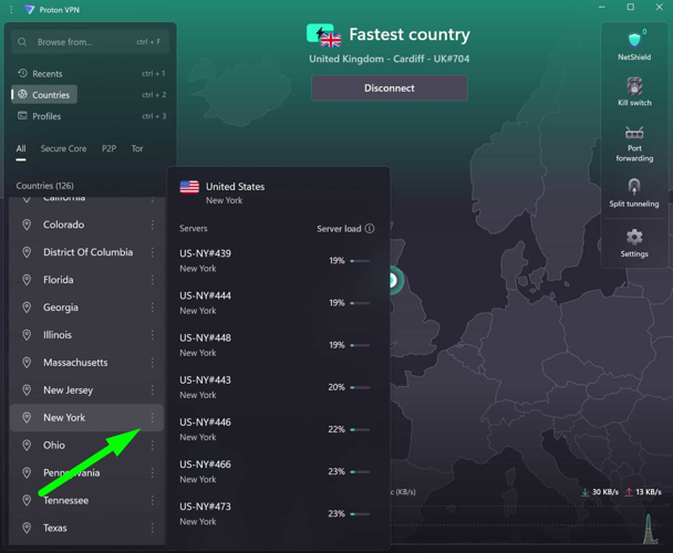 ProtonVPN stands out among VPN providers because it allows users to select individual servers for their connection. Simply click on the dots next to each city to view available options. With the latest interface update, you can now easily switch key settings right from the main dashboard, making your browsing experience more streamlined and customizable.