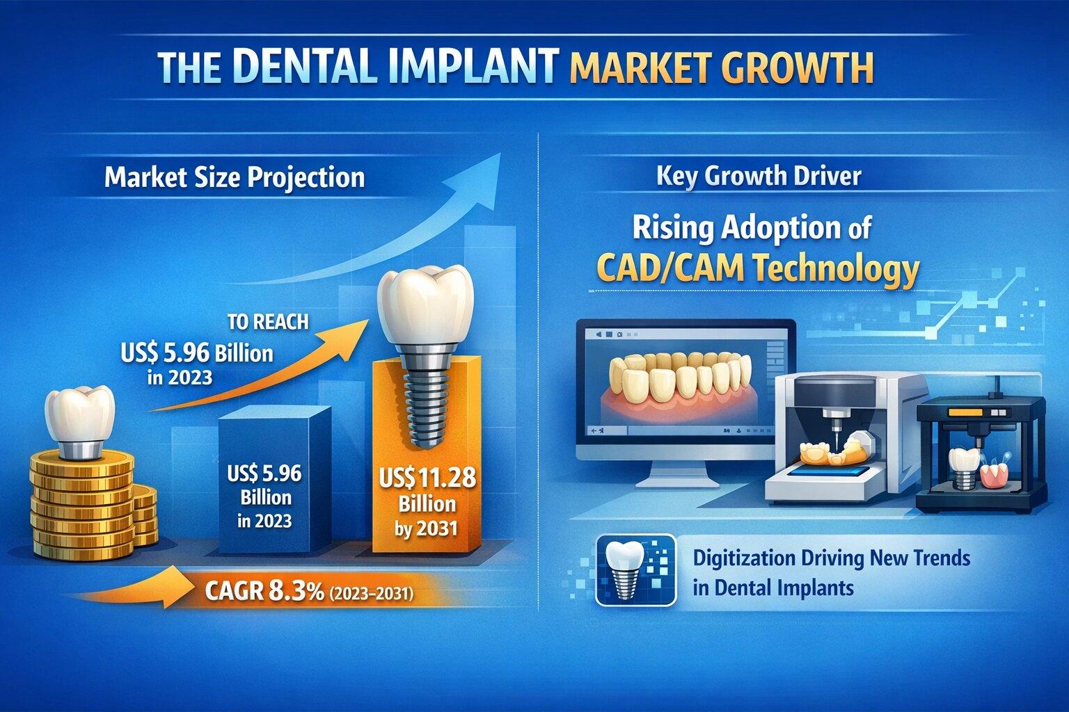 The Dental Implant Market is witnessing steady expansion, supported by strong demographic and clinical demand fundamentals. The market size is projected to reach US$ 11.28 billion by 2031 from US$ 5.96 billion in 2023, registering a CAGR of 8.3% during 2023 to 2031. This growth trajectory reflects rising awareness of oral health, growing acceptance of implant procedures, and continuous technological evolution. Increasing digitization through CAD/CAM technology is reshaping clinical workflows, improving precision, and reducing treatment timelines, thereby strengthening patient confidence and practitioner efficiency.
