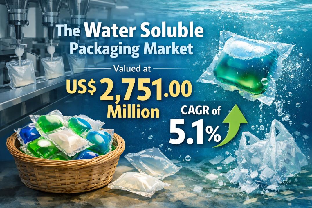 The Water Soluble Packaging Market was valued at US$ 2,751.00 million and is projected to reach US$ 4,295.6 million, growing at a CAGR of 5.1%. Increasing environmental concerns and regulatory pressure to reduce single use plastic waste are significantly contributing to the adoption of water soluble packaging solutions. Industries are actively shifting towards sustainable materials to align with global environmental standards and consumer expectations.