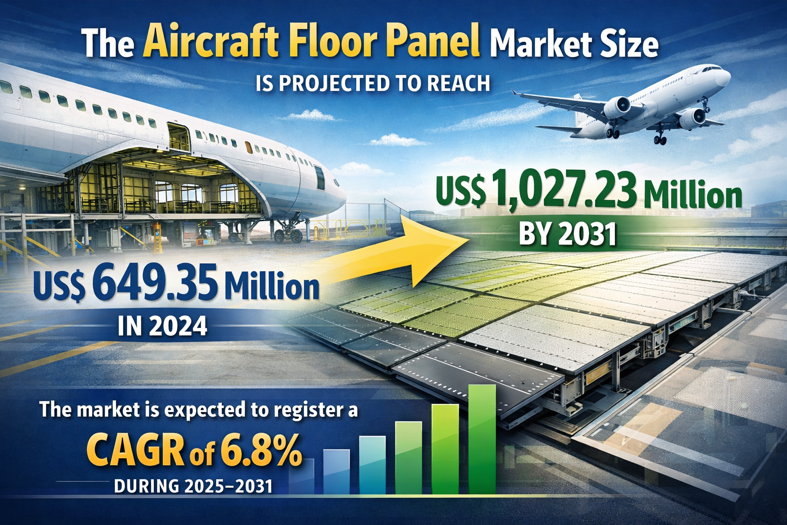 The aircraft floor panel market is witnessing steady expansion as the aviation industry continues to recover and modernize its fleets. Aircraft floor panels are critical structural components installed beneath the cabin interior to support passenger seating, cargo loads, and cabin equipment. These panels must be lightweight, durable, and resistant to environmental stress to ensure safety and efficiency in aircraft operations. The market size is projected to grow from US$ 649.35 million in 2024 to US$ 1,027.23 million by 2031, registering a compound annual growth rate of 6.8% during the period from 2025 to 2031.