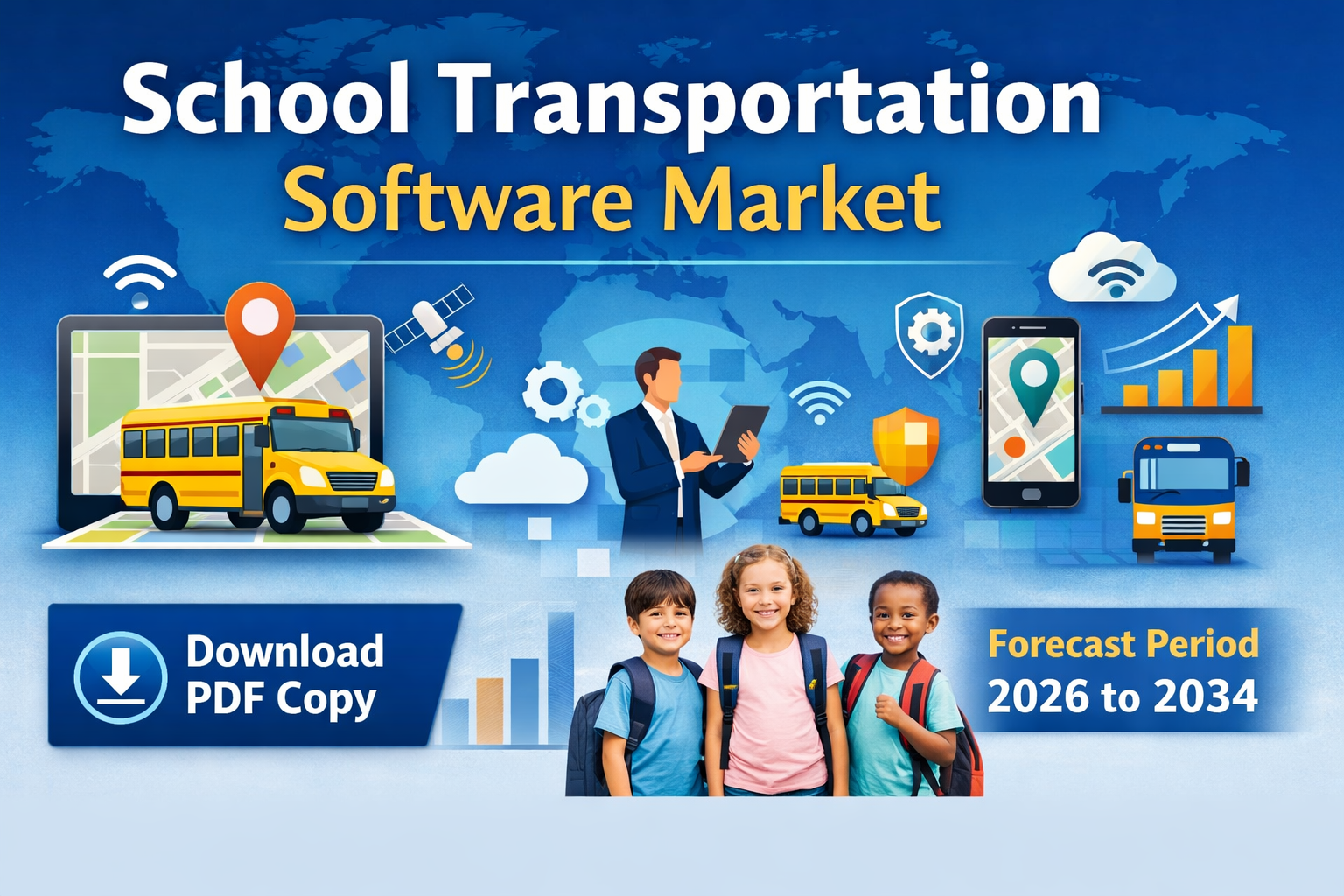 Key growth drivers include increasing focus on student safety, adoption of GPS-enabled tracking systems, demand for efficient route planning, rising digitalization in the education sector, and growing adoption of cloud-based transportation management platforms.