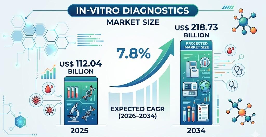 The In-Vitro Diagnostics Market Scope highlights the industry’s expansion from US$ 112.04 billion in 2025 to US$ 218.73 billion by 2034, registering a CAGR of 7.8% during the forecast period. This growth is supported by rising demand for accurate and rapid diagnostic solutions, along with increasing healthcare awareness and investments in biotechnology and digital health integration.