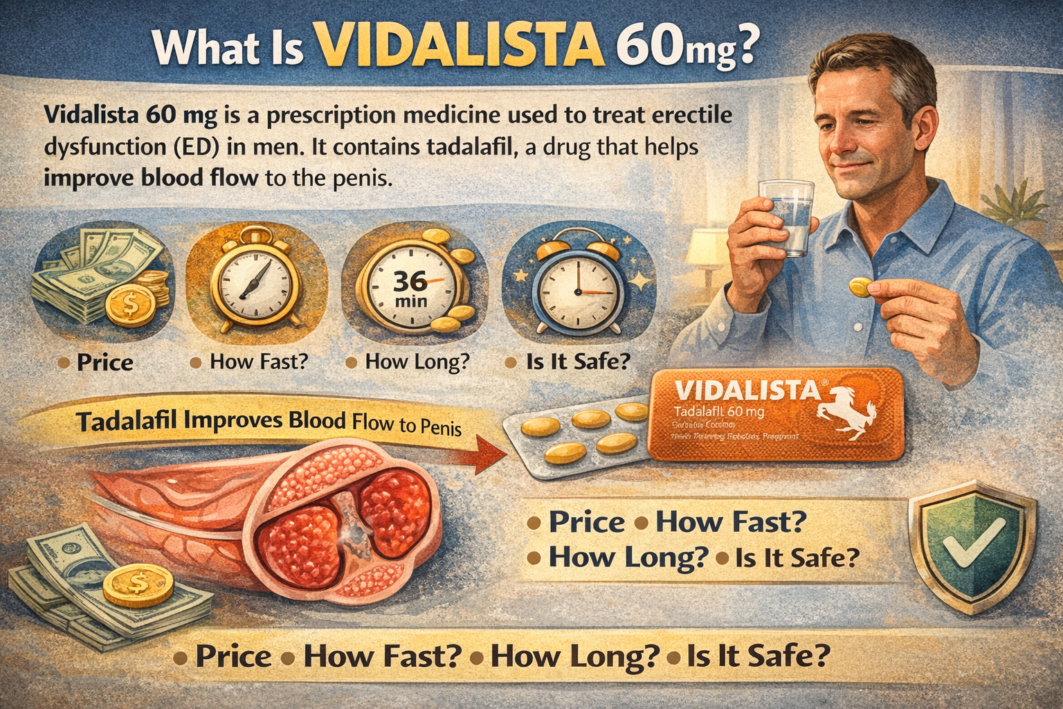 Vidalista 60 mg is a high-strength prescription medicine used to treat erectile dysfunction (ED) in men. It contains tadalafil, a PDE5 inhibitor that helps increase blood flow to the penis during sexual stimulation. Many people choose Vidalista 60 mg because it may provide longer-lasting support for erections.