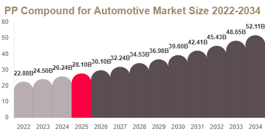 The global pp compound for automotive market size was valued at USD 32.48 billion in 2025 and is projected to reach USD 34.15 billion in 2026. By 2034, the market is expected to reach USD 58.72 billion, growing at a CAGR of 7.1% during 2025–2034.