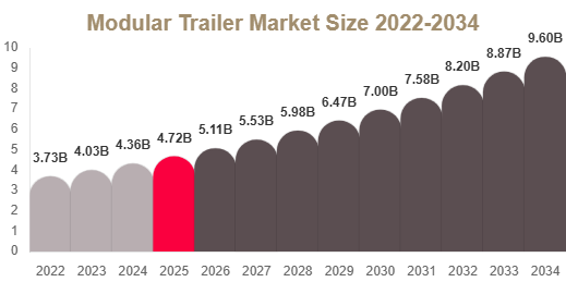 The global modular trailer market size was valued at USD 5.92 billion in 2025 and is projected to reach USD 6.18 billion in 2026. By 2034, the market is expected to reach USD 10.84 billion, growing at a CAGR of 6.7% during 2025–2034.