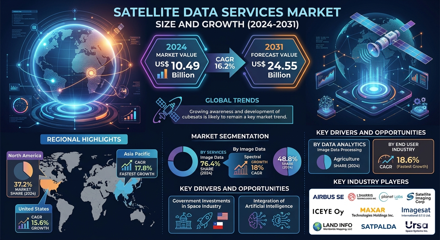 The Satellite Data Services Market Trends is witnessing strong global growth, driven by rising demand for high-resolution Earth observation data and increasing adoption of geospatial intelligence across multiple industries. The satellite data services market size was valued at US$ 10.49 billion in 2024 and is projected to reach US$ 24.55 billion by 2031, registering a CAGR of 16.2% from 2025 to 2031. Growth is supported by expanding investments in space programs, rapid deployment of satellite constellations, and increasing use of satellite-based analytics in defense, agriculture, energy, and urban development. As digital transformation accelerates globally, satellite intelligence is becoming a critical component of the global data ecosystem.
