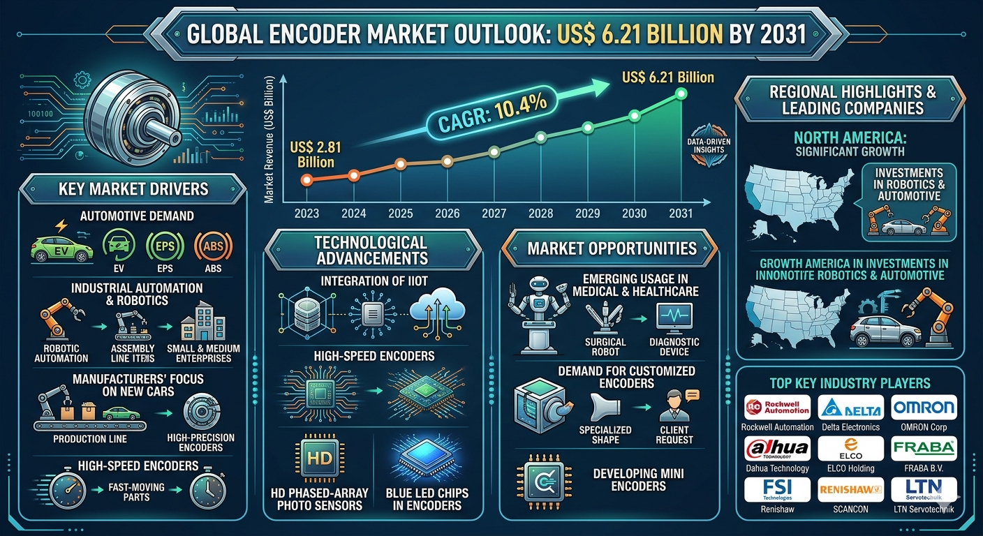 The Encoder Market Forecast is experiencing significant expansion driven by rising adoption of industrial automation, increasing deployment of robotics systems, and the growing implementation of Industry 4.0 technologies. The encoder market size is projected to reach US$ 6.21 billion by 2031 from US$ 2.81 billion in 2023, registering a CAGR of 10.4% during 2023–2031. Growing demand for high-precision motion feedback systems, the expansion of automated manufacturing facilities, and increasing integration of advanced industrial equipment are among the key factors contributing to the growth of encoder technologies worldwide.