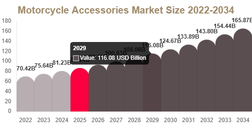 As per Redline Pulse, the motorcycle accessories market size for 2025 serves as the base valuation for the study period, with projections extending to 2034. The report provides: Market size evaluation for 2025 (base year) Forecast estimation for 2034 CAGR growth rate across the analysis period This reflects the strong expansion of the motorcycle accessories ecosystem driven by both OEM integration and aftermarket demand growth globally.