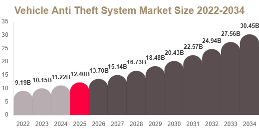 The vehicle anti theft system market is experiencing steady growth due to increasing vehicle theft incidents, rising awareness about automotive security, and growing adoption of advanced electronic security systems. These systems include alarms, immobilizers, steering locks, GPS tracking devices, biometric authentication, and advanced smart locking mechanisms designed to prevent unauthorized access and vehicle theft. According to Redline Pulse, the market is projected to expand significantly during the forecast period from 2025 to 2034, driven by increasing vehicle ownership, technological advancements in connected security systems, and rising integration of IoT-based automotive protection solutions.