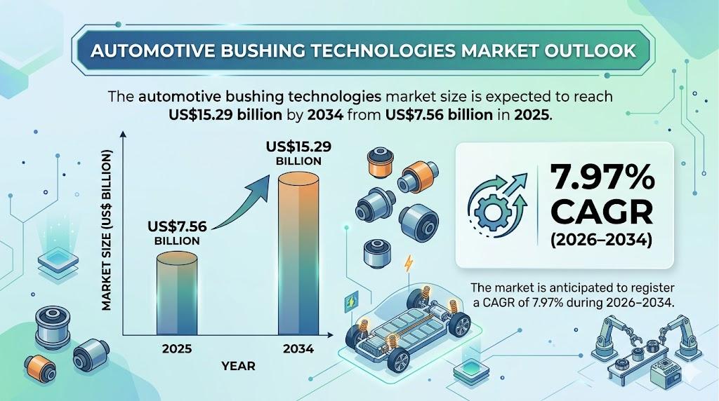 The automotive bushing technologies market size is expected to reach US$15.29 billion by 2034 from US$7.56 billion in 2025. The market is anticipated to register a CAGR of 7.97% during 2026–2034. This robust growth is fueled by the rising production of passenger and commercial vehicles globally, alongside a growing consumer preference for luxury and comfort features. As urban infrastructure expands and long distance travel remains a necessity, the demand for components that ensure a smooth driving experience is at an all time high.
