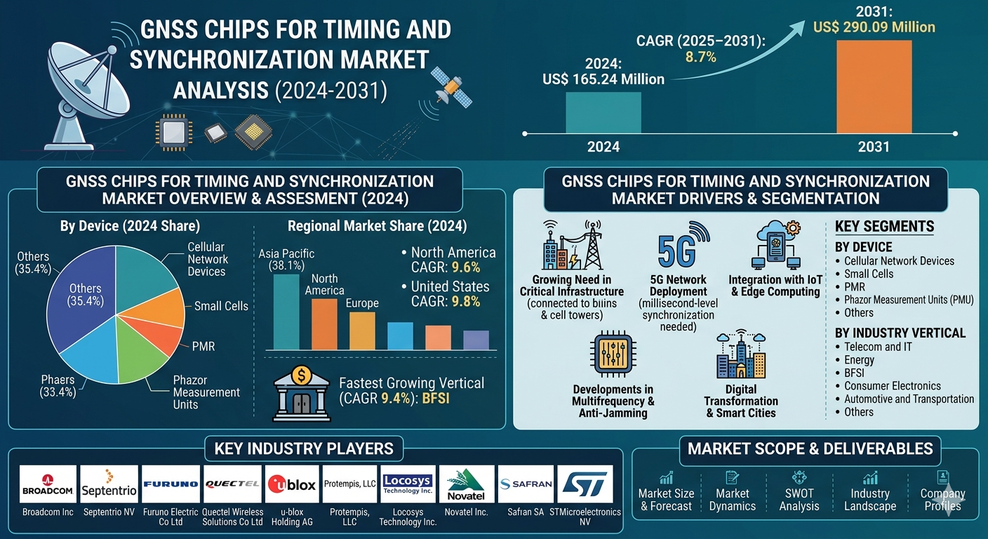 The GNSS Chips for Timing and Synchronization Market Insights is witnessing steady expansion due to the increasing need for accurate time synchronization across modern communication and computing systems. The market size is projected to grow from US$ 165.24 million in 2024 to US$ 290.09 million by 2031, registering a CAGR of 8.7% during the forecast period from 2025 to 2031. The rising deployment of next-generation communication networks, expanding data center infrastructure, and increasing adoption of satellite-based timing technologies in critical industries are among the key factors supporting the growth of this industry.
