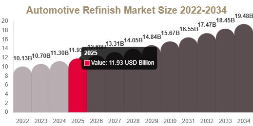 The automotive refinish market size for 2025 and projected value for 2034 along with CAGR are provided in the Redline Pulse report.