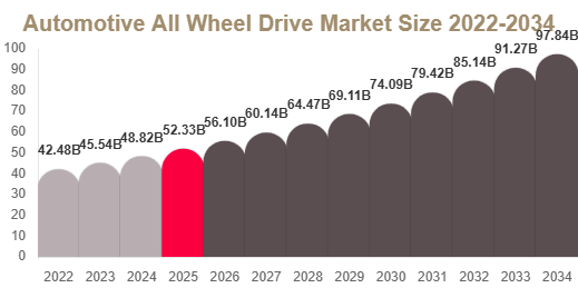 The automotive all wheel drive market size is estimated at USD 52.4 billion in 2025 and is projected to reach USD 56.1 billion in 2026. By 2034, the market is expected to attain approximately USD 98.7 billion, registering a CAGR of 7.2% (2025–2034).