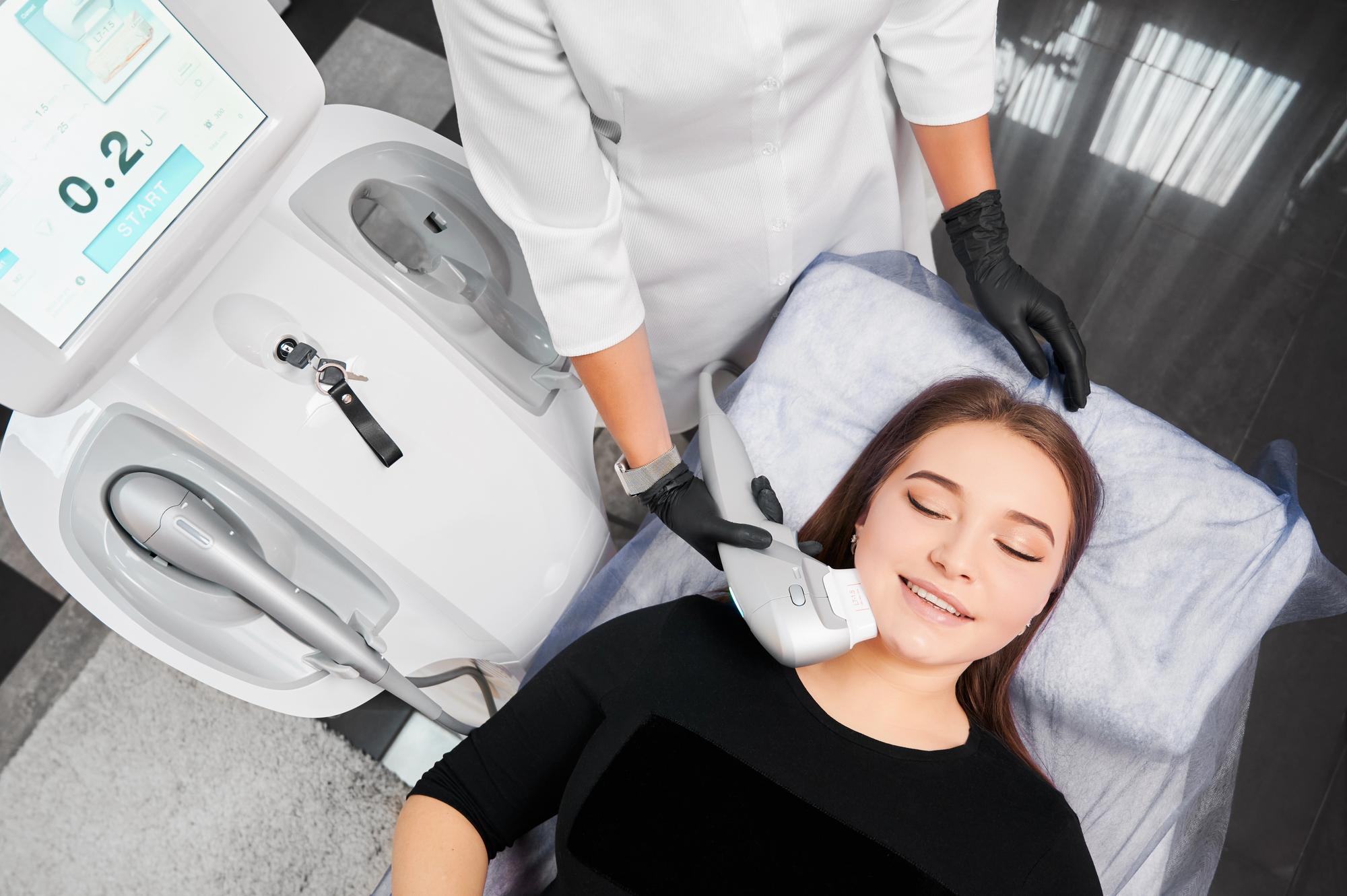 A specialized device is used to deliver targeted energy to specific layers of the skin.