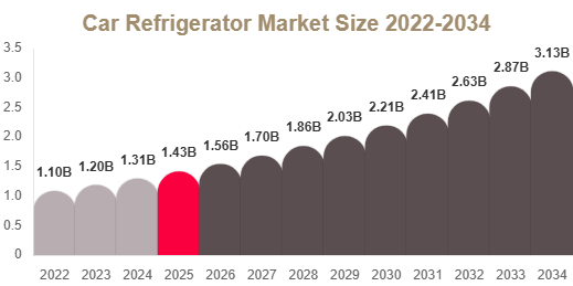 The Car Refrigerator market size was valued at USD 1.42 billion in 2025 and is projected to reach USD 1.56 billion in 2026. By 2034, the market is expected to grow significantly to around USD 3.12 billion, registering a CAGR of 9.1% from 2025 to 2034.