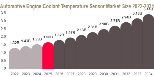 The Automotive Engine Coolant Temperature Sensor market size was valued at USD 1.68 billion in 2025 and is projected to reach USD 1.82 billion in 2026. By 2034, the market is expected to reach approximately USD 3.45 billion, registering a CAGR of 8.3% (2025–2034) during the forecast period.