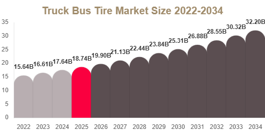 The Truck Bus Tire market size was valued at USD 18.6 billion in 2025 and is projected to reach USD 19.9 billion in 2026. By 2034, the market is expected to attain approximately USD 32.4 billion, registering a CAGR of 6.2% (2025–2034) during the forecast period.