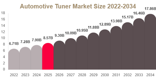 The Automotive Tuner market size was valued at USD 8.6 billion in 2025 and is projected to reach USD 9.3 billion in 2026. By 2034, the market is expected to attain approximately USD 17.9 billion, growing at a CAGR of 8.5% during 2025–2034.
