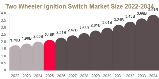 The Two Wheeler Ignition Switch market size was valued at USD 2.15 billion in 2025 and is projected to reach USD 2.31 billion in 2026. By 2034, the market is expected to reach approximately USD 3.92 billion, registering a CAGR of 6.8% during 2025–2034.