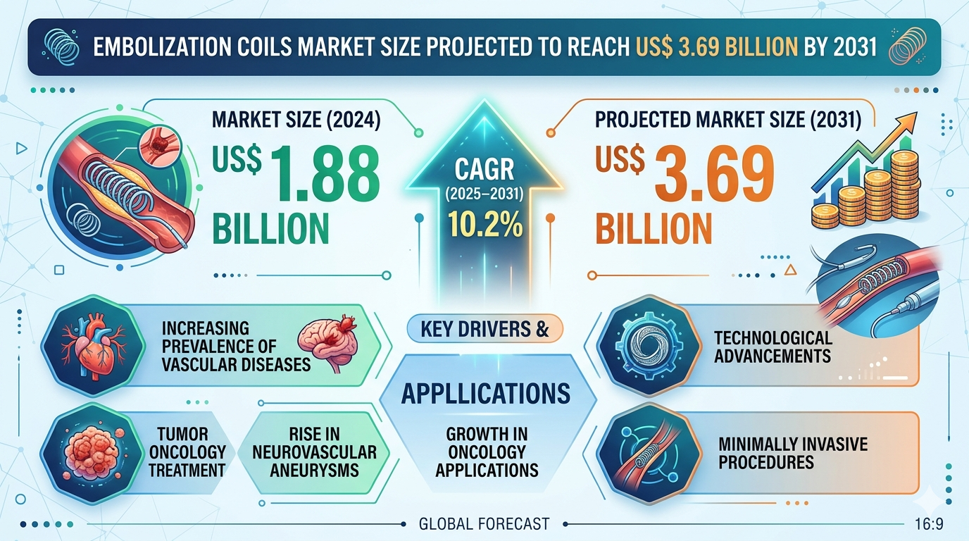 The Embolization Coils Market size is projected to reach US$ 3.69 billion by 2031 from US$ 1.88 billion in 2024. The market is expected to register a CAGR of 10.2% during 2025–2031.