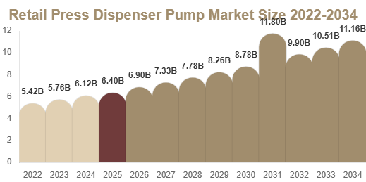 The retail press dispenser pump market size was valued at USD 6.5 billion in 2025.