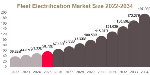 The global fleet electrification market size was valued at USD 58.42 billion in 2025 and is projected to reach USD 67.18 billion in 2026. By 2034, the market is forecast to reach USD 196.54 billion, registering a CAGR of 14.4% from 2025 to 2034.