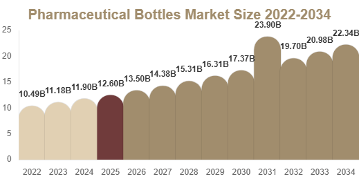 The pharmaceutical bottles market size was valued at USD 12.8 Billion in 2025 and is projected to reach USD 22.6 Billion by 2034, expanding at a CAGR of 6.5% during the forecast period.