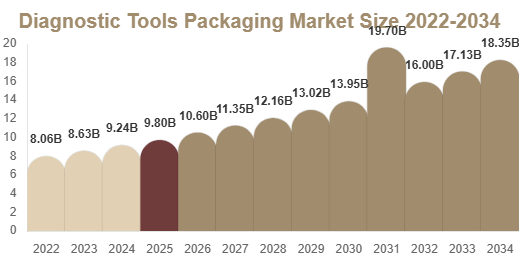 The diagnostic tools packaging market size was valued at USD 6.2 Billion in 2025 and is projected to reach USD 12.7 Billion by 2034, expanding at a CAGR of 8.3% during the forecast period.