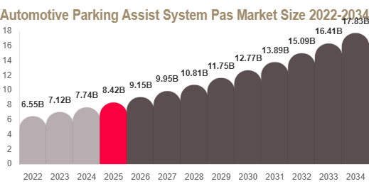 The global Automotive Parking Assist System PAS market size is estimated at USD 8.40 billion, and it is projected to reach USD 9.15 billion in 2026. By 2034, the market is expected to reach approximately USD 17.80 billion, registering a CAGR of 8.7% during 2025–2034.
