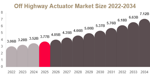 The Off Highway Actuator market size is estimated at USD 3.75 billion in 2025, and it is projected to reach USD 4.05 billion in 2026. By 2034, the market is expected to reach approximately USD 7.65 billion, registering a CAGR of 7.3% during 2025–2034.