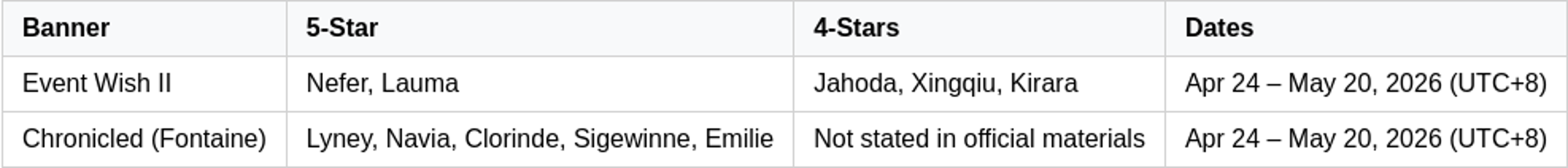 Featured 5-star returns: Nefer (Dendro, Catalyst) and Lauma (Dendro, Catalyst) — both receiving their first reruns.
