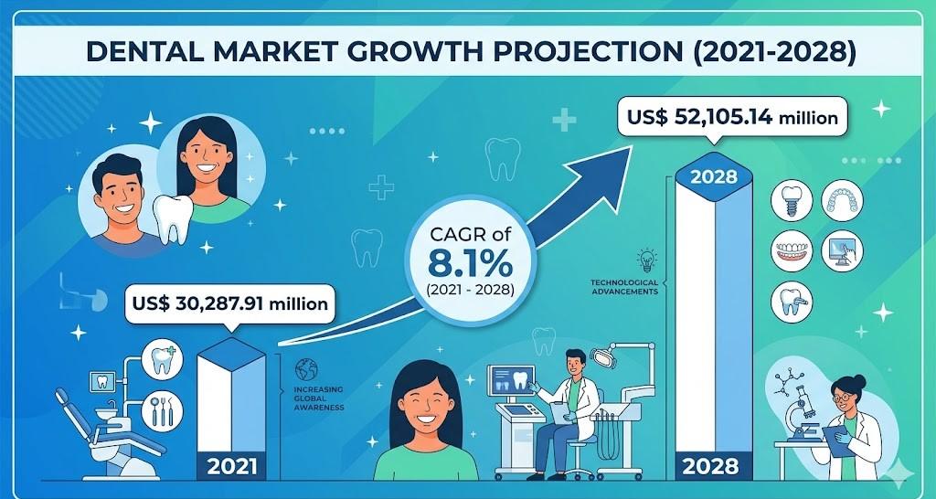 The Dental Market Opportunities are expanding significantly due to the combined impact of rising disease prevalence, technological innovation, and increasing consumer focus on aesthetics. The sector is projected to grow from US$ 30,287.91 million in 2021 to US$ 52,105.14 million by 2028, registering a CAGR of 8.1%. This growth is supported by strong demand for advanced dental solutions and the rapid evolution of treatment methodologies across regions.