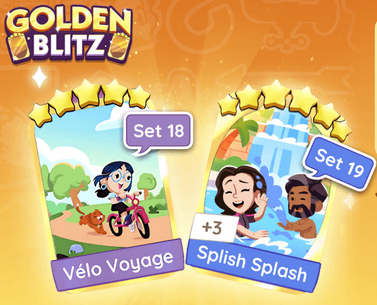 The designated gold stickers for Monopoly Go Golden Blitz event would be for sale at IGGM.com on August 25th, called "Set18 - Vélo Voyage and Set19 - Splish Splash"