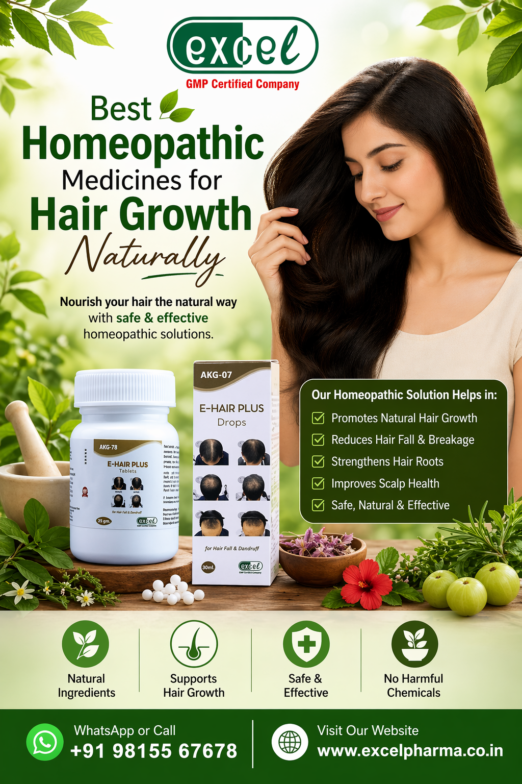 Homeopathy offers a natural and holistic approach to hair growth by addressing the root causes of hair fall, such as stress, hormonal imbalance, and nutritional deficiencies. It works gently to strengthen hair follicles, improve scalp health, and promote long-lasting regrowth. At Excel Pharma, effective solutions like E-Hair Plus Drops (AKG-07) and E-Hair Plus Tablets (AKG-78) help reduce hair fall and support stronger, healthier, and more vibrant hair naturally, without harsh chemicals.