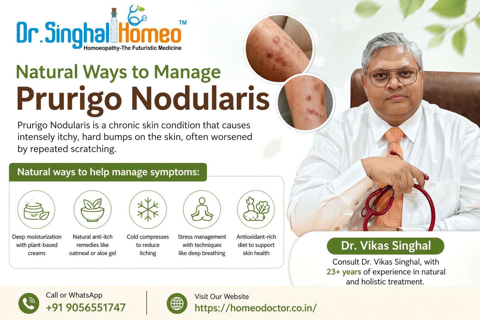 Prurigo Nodularis is a chronic skin condition that leads to intensely itchy, hard bumps on the skin, often aggravated by repeated scratching. A natural approach can help manage symptoms gently and effectively, including regular use of plant-based moisturizers, soothing remedies like aloe vera or oatmeal, cold compresses to reduce itching, stress management through relaxation techniques, and a healthy antioxidant-rich diet to support skin healing. For expert guidance, you can consult Dr. Vikas Singhal at Dr. Singhal Homeo, who has over 23 years of experience in natural and holistic treatment. For more information, call or WhatsApp at +91 9056551747.